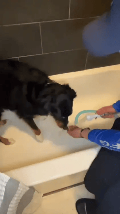 We have a 75lb golden who HATES baths. I slipped it on, turned the water on low, and she actually stood still for once. Done in 10 minutes, bathroom was barely wet. Already told three friends about it.