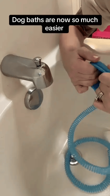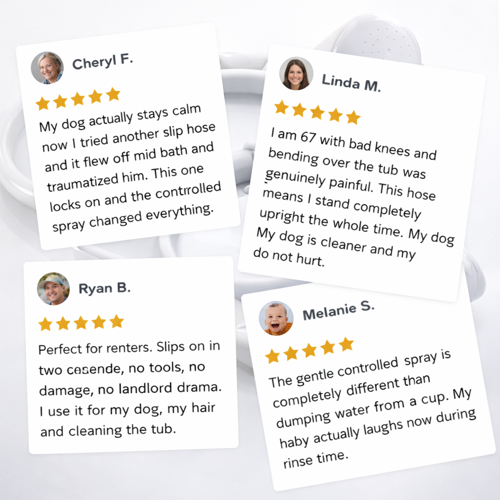 TubBuddy slips onto any faucet in 3 seconds — no tools, no mess. The 5-foot flexible hose and gentle spray head keep your pet calm while you stay completely dry. Slip it on, wash your pet, slide it off. Done in 10 minutes.